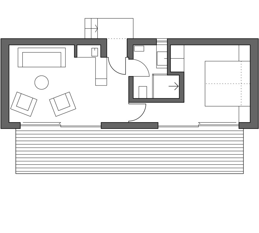 Das Gartenhaus hat ein Schlafzimmer und einen Wohnbereich mit offener Küche. Die großen Fensterfronten und die Holzterrasse mit Blick auf den Park erstrecken sich über die gesamte Länge des Hauses.
