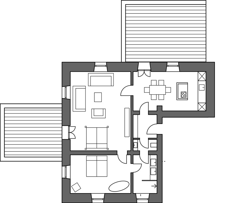 Eine große Küche mit Esstisch, ein Wohn-/Schlafraum und zwei große Terrassen nach Süden und Osten mit Blick über das ganze Gelände. Ein gemeinsames Bad und eine freistehende Badewanne im Schlafzimmer.