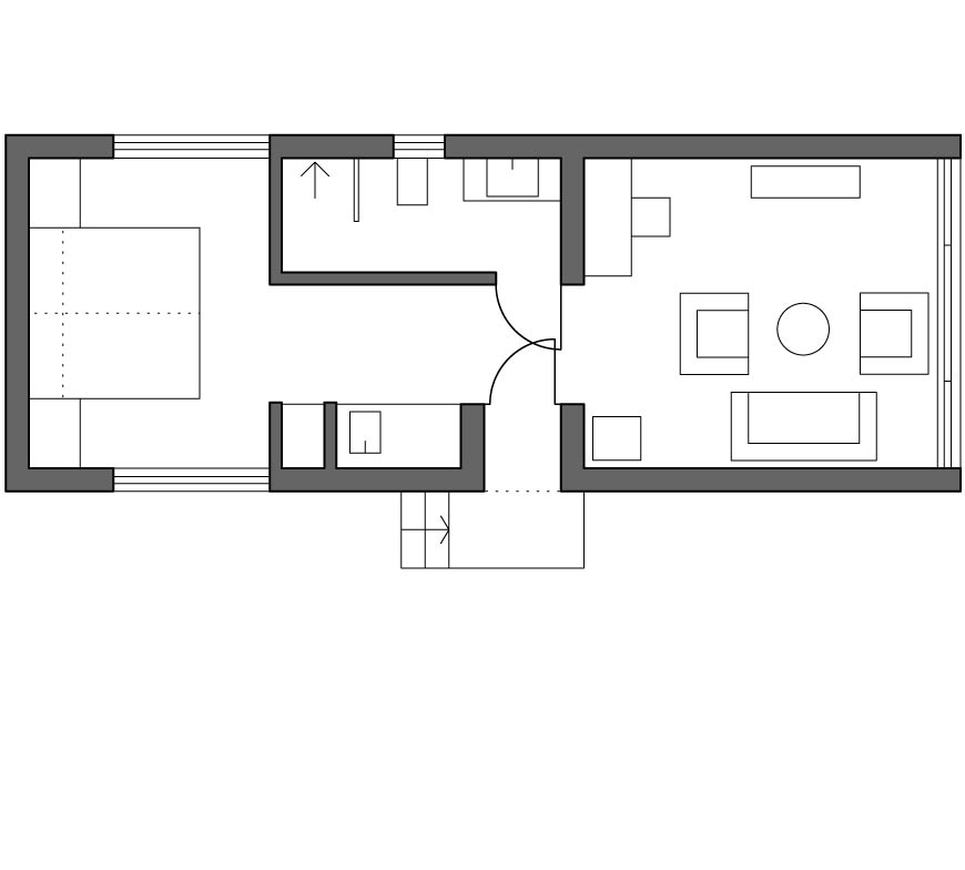 Die beiden Teichhäuser schweben zu einem Drittel über dem Teich. Innen ein Wohnraum mit Panoramafenster, eine Küchenzeile und ein Schlafbereich mit großem Dachfenster.